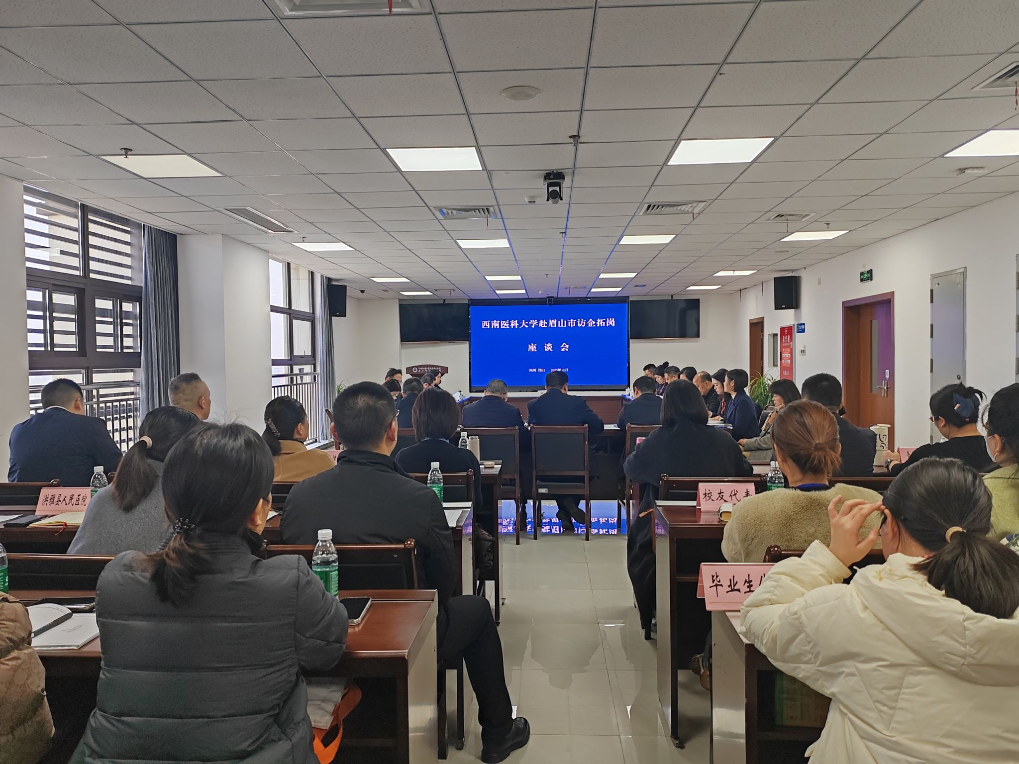 座谈会上,眉山天府新区社会事务局、洪雅县卫健局介绍了本地引才政策与人才队伍建设情况;眉山市中医医院、彭山区人民医院结合发展需求,详解人才引进政策与岗位缺口。校友代表分享了在眉山的工作成长经历。双方围绕医学人才培养、实习实训、科研协作及毕业生就业等议题深入交流,达成“人才共育、资源共享、发展共赢”的合作共识。