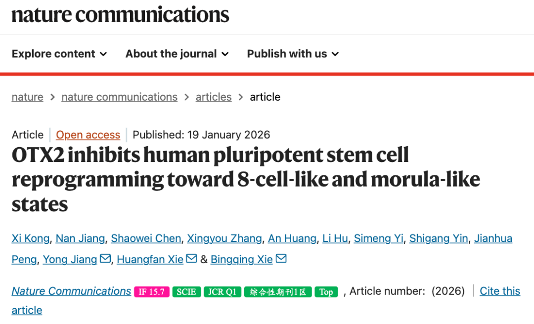 近日,西南医科大学附属医院神经外科研究团队在国际知名期刊《自然·通讯》(Nature Communications,中科院1区,影响因子15.7)上发表重磅研究成果,首次揭示同源框转录因子OTX2是阻碍人多能干细胞向8细胞期全能性干细胞重编程的关键抑制因子。该发现为解析人类早期胚胎发育机制、高效制备全能性干细胞提供了全新理论框架,相关研究于2026年1月19日正式刊发。