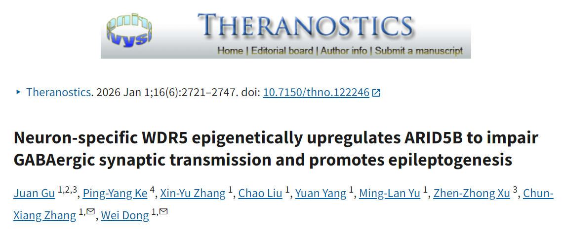 近日,我校心血管医学研究所董伟/张春祥教授团队在国际知名期刊《Theranostics》(IF:13.1/Q1)上发表重要科研论文,该研究首次揭示神经元特异性 WDR5-H3K4me3-ARID5B 表观遗传轴在 TLE 中的核心作用:WDR5-KMT2 复合物激活导致 H3K4me3 升高,促进 ARID5B 转录,进而抑制 GABAₐR 表达,破坏 E/I 平衡。靶向该轴可改善癫痫表型,为 TLE 提供了新的表观遗传治疗靶点。