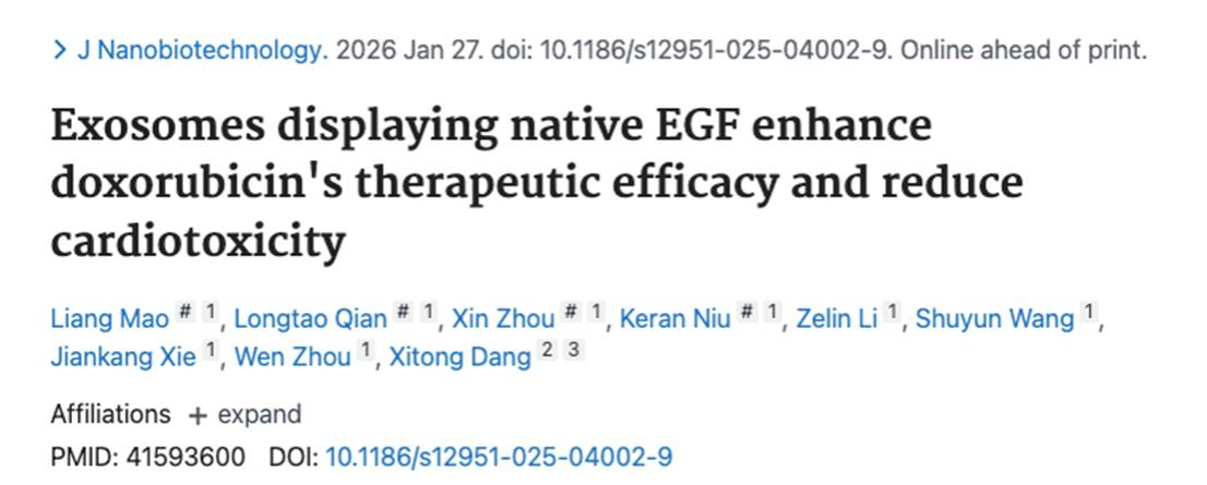近日,西南医科大学心血管医学研究所/医学电生理学教育部重点实验室党喜同教授团队在国际知名期刊《Journal of Nanobiotechnology》(影响因子12.6,中科院1区)发表题为“Exosomes displaying native EGF enhance doxorubicin’s therapeutic efficacy and reduce cardiotoxicity”的研究论文。该研究创新设计出一种增强化疗药物抗肿瘤疗效并有效减轻心脏毒性的新策略。