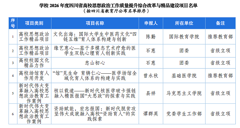 近日,四川省教育厅公布2026年度全省高校思想政治工作质量提升综合改革与精品建设项目遴选结果,我校11个项目成功立项,其中3个项目被推荐至教育部参评,数量创历史新高,充分彰显了学校思想政治工作的扎实基础与良好成效。本次立项项目覆盖高校思想政治工作精品项目、高校校园文化精品力作、高校场馆育人作用开发、高校辅导员名师工作室、新时代伟大变革融入高校思想政治教育工作案例、导学思政工作案例、高校国家安全教育名师、高校网络教育名师、全国高校综合性教育实践体验基地9个类别。