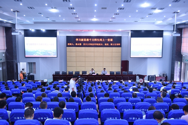 为深入学习习近平总书记在北京大学师生座谈会和纪念马克思诞辰200周年大会上的重要讲话精神, 6月19日上午,“学习新思想千万师生同上一堂课”活动在城北校区逸夫图书馆学术报告厅举行 。四川大学经济学院院长蒋永穆教授以“深刻感悟和把握马克思主义真理力量”为题给我校师生上了一场别开生面的思政课。学校校领导、校级党委中心组成员,各单位、各部门处科级领导干部,学生辅导员、马克思主义学院教师代表近300人到场聆听。同时,1000余名师生通过学校官方微信、校园网观看了网络直播。