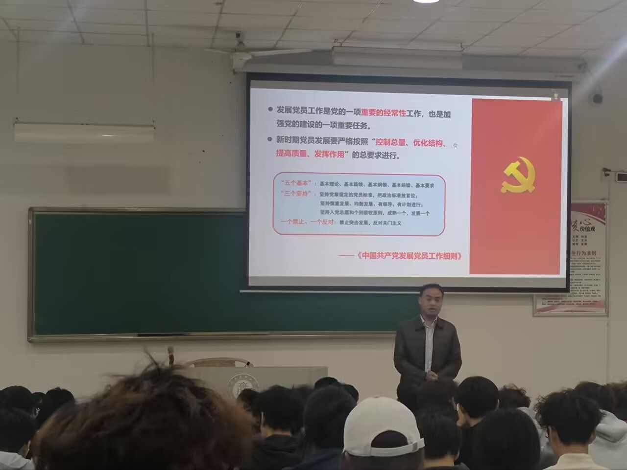 刘泸围绕“为什么要加入中国共产党”“如何认识中国共产党”“大学生入党的基本流程”以及“如何争取早日入党”四个方面进行讲授。他结合中国共产党百年奋斗的光辉历程和伟大成就,带领学生学习了党的性质、宗旨、指导思想和奋斗目标,深刻阐释了党的先进性与纯洁性,帮助同学们端正入党动机,明确责任与担当。他还详细介绍了撰写入党申请书、思想汇报的基本要求,以及发展入党流程,为有志于加入党组织的同学们指明了努力方向。