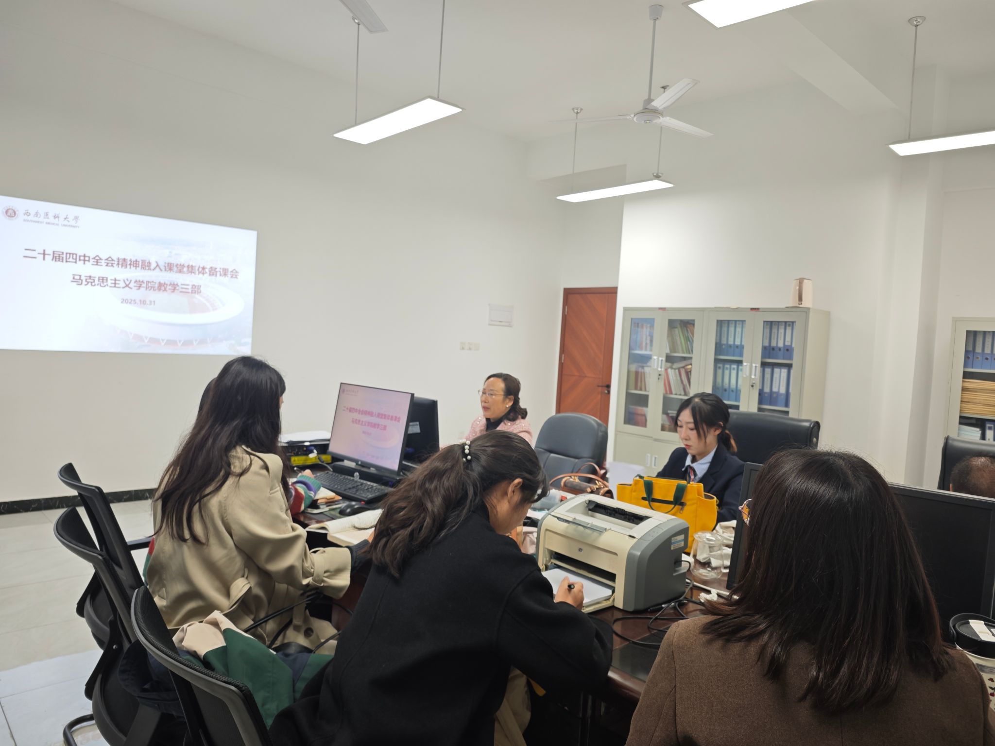 近日,马克思主义学院教学三部在文渊楼423办公室组织开展党的二十届四中全会精神融入课堂集体备课活动。活动由教学部主任王虹主持,教学部全体教师参会。