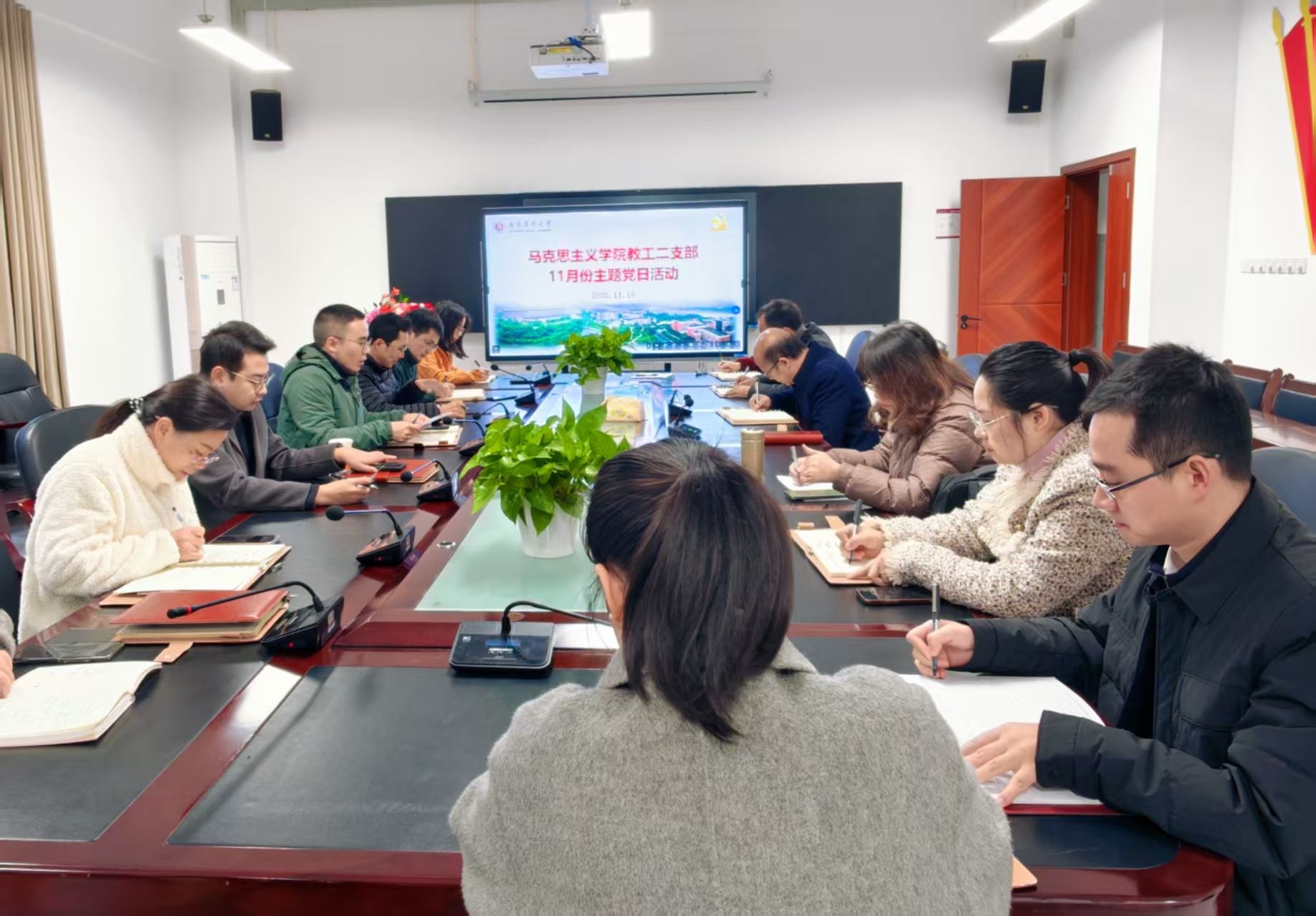 11月18日,马克思主义学院教工二支部在文渊楼432会议室开展11月份主题党日活动。活动由党支部书记王先伟主持,全体党员同志参会,围绕中央与地方重要会议精神及经典著作内容开展集中学习,推动理论学习与教学科研实践深度融合。