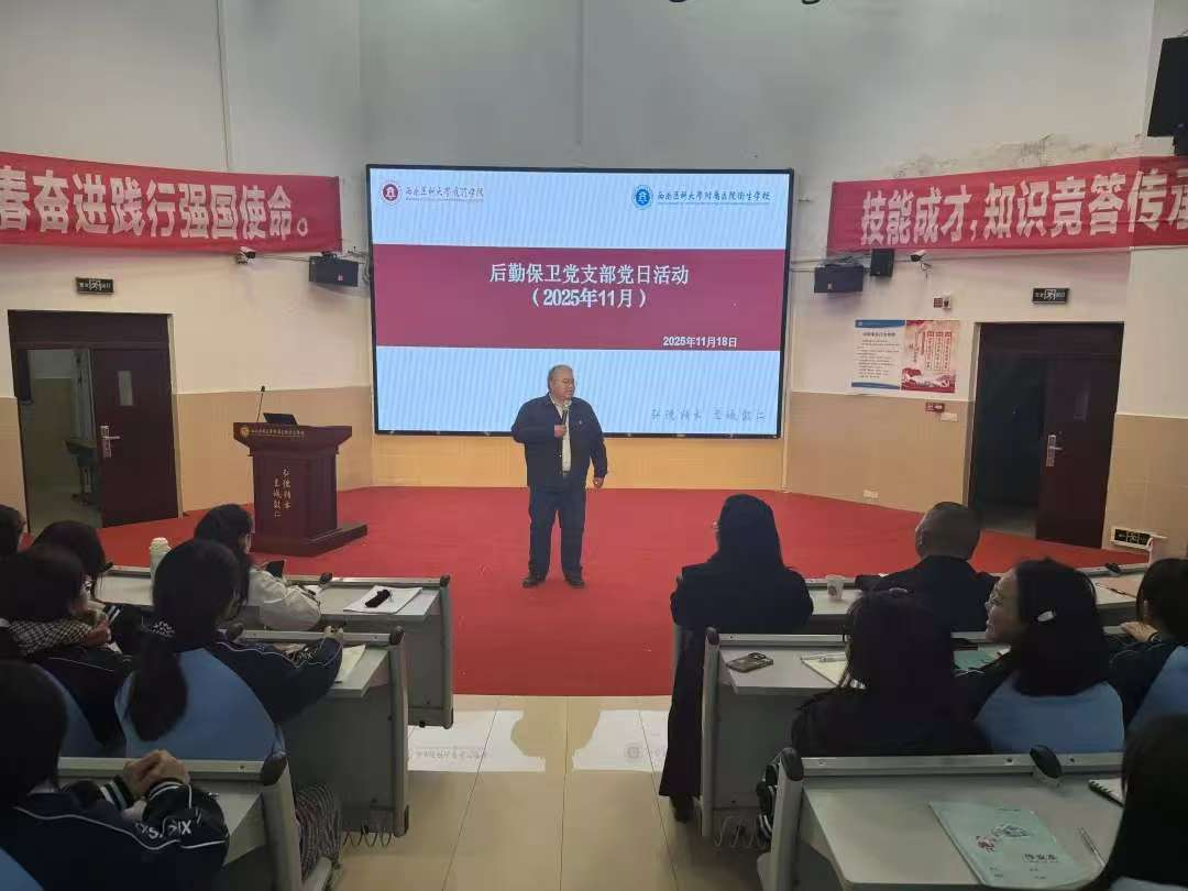 为深入推进“支部联系基层”党建工作,厚植青年学生的家国情怀与红色基因,11月18日,后勤党支部以“传承红色薪火,争做时代新人”为主题,邀请护理学院•附属医院卫校副院(校)长谢长友为师生讲述红色党史故事,卫校后勤保卫科副科长程崧、学生科副科长贾颖、校区管委会副主任肖艳、各党员同志及班级学生团员参加。