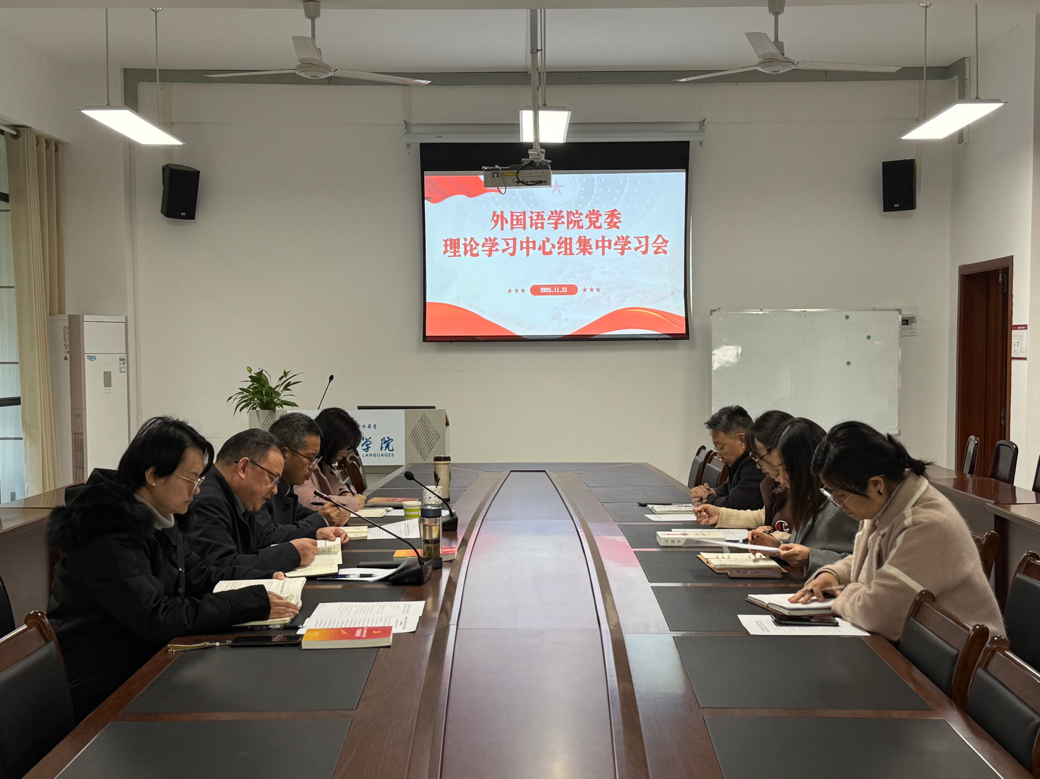 11月21日,外国语学院党委理论学习中心组在城北校区文渊楼134会议室举行11月集中学习会。会议围绕深入学习贯彻党的二十届四中全会精神,结合学院发展实际进行专题学习和研讨。学院党委书记周晓昀主持会议,学院党委委员、专职组织员、行政科室负责人参加学习。校党委理论学习讲师团成员、人文与管理学院党委书记谷满意教授莅临指导。