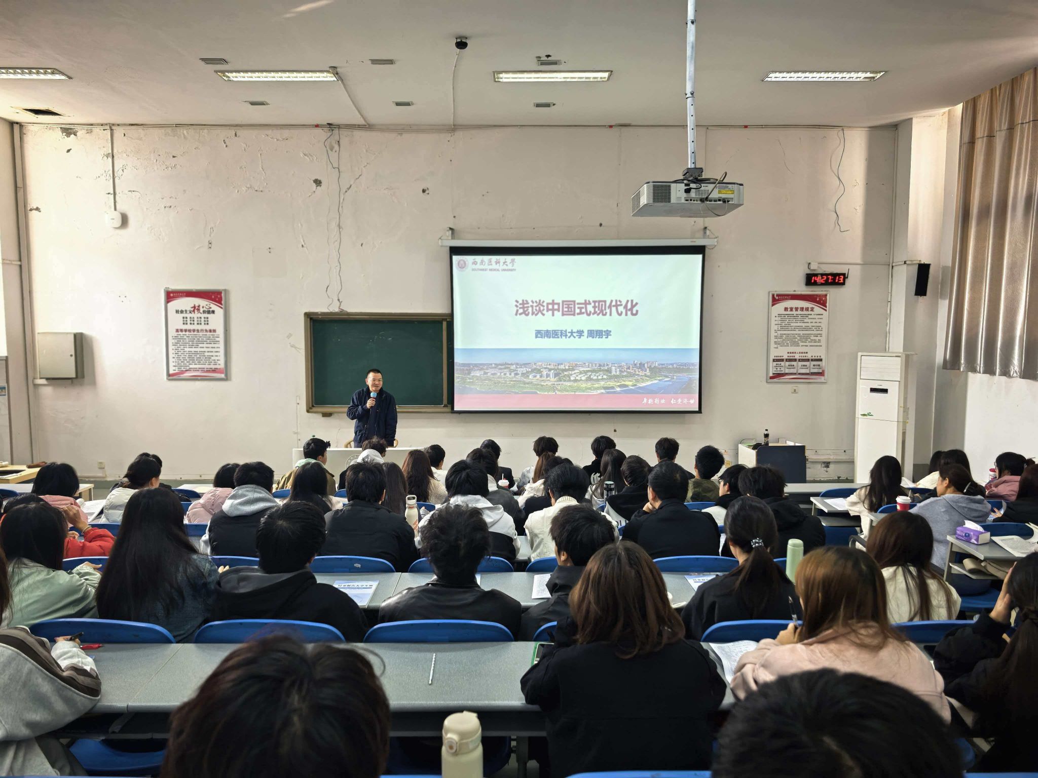 12月5日,学校党委常委、副校长周翔宇深入思政课教学一线,在明理楼106室,以《浅谈中国式现代化》为题,为2025级医学检验技术专业学生讲授了一堂生动的“形势与政策”课。