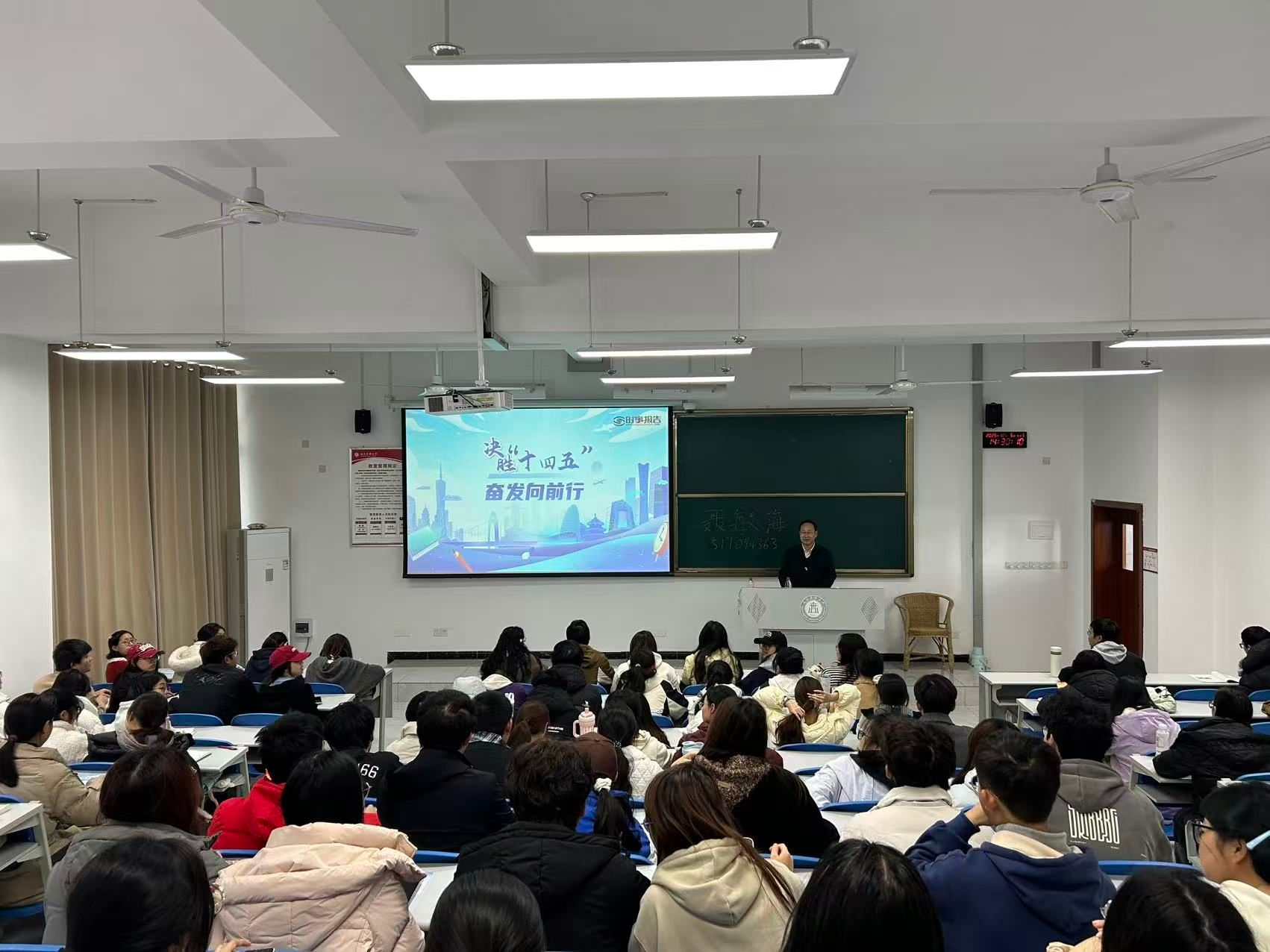 聂敏海充分发挥“形势与政策”课程育人“主渠道”作用,坚持思政课“立德树人”的教育目标,以《决胜“十四五”奋发向前行》为主题进行了讲授,在课堂上深入浅出地解读了国家“十四五”规划的宏伟蓝图、战略部署与重大意义,还就同学们关心的相关理论与实践问题进行了清晰透彻的系统解答。授课过程中,聂敏海特别注重将党的二十届四中全会精神深度融入课程教学,将宏大的政策叙事与生动的现实案例相结合,引导同学们深刻理解国家发展阶段、把握时代发展大势,明确自身肩负的责任与使命。