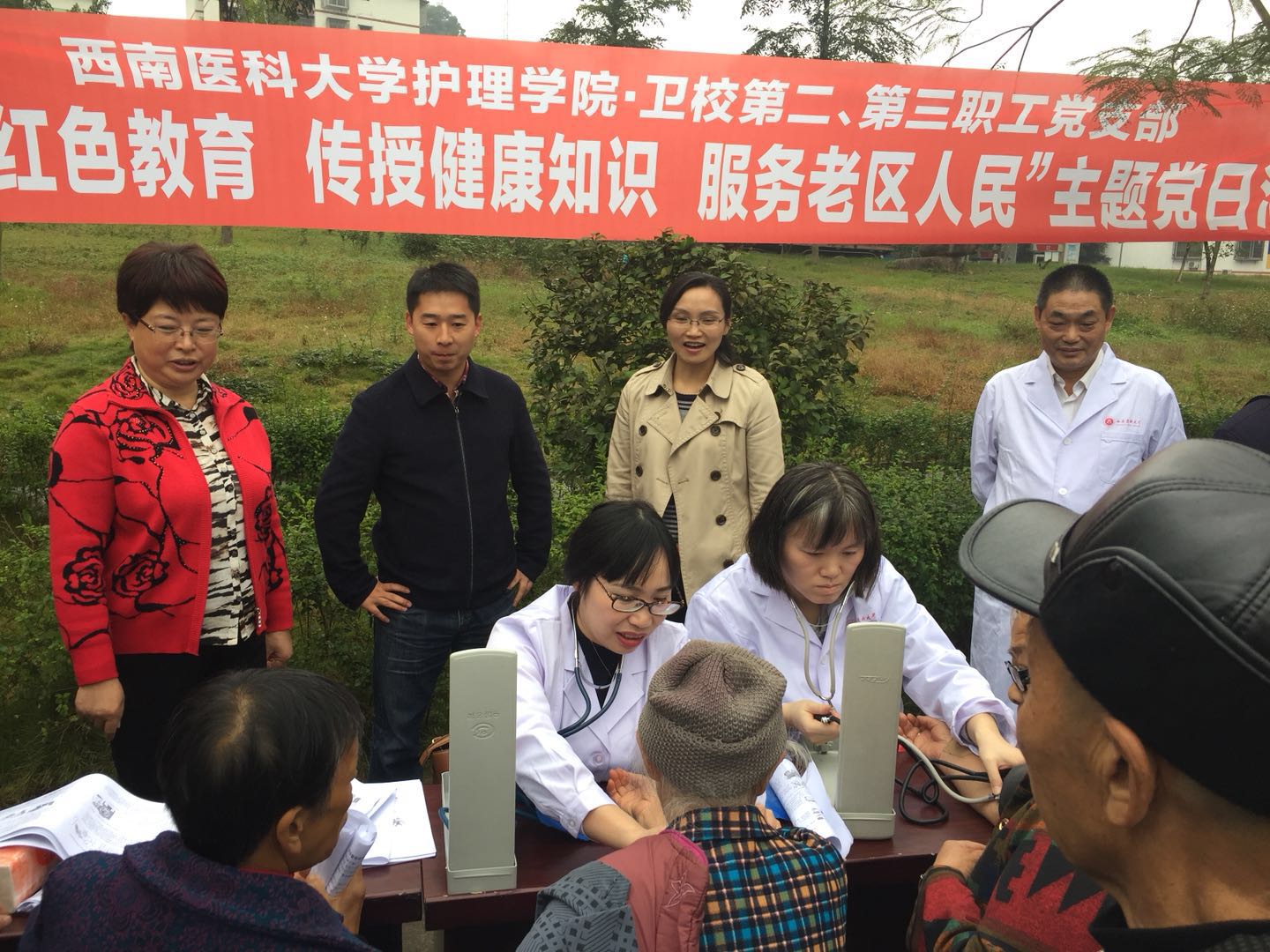 十九大召开后,护理学院·卫校各党支部积极学习十九大精神,认真筹划主题党日活动。全体同志先后为龙车镇老区人民提供健康咨询和宣教服务,普及卫生知识,提高健康水平:包括发放健康知识宣传单、常见慢病健康管理宣教资料、放映艾滋病预防等宣传片;参观了革命旧址抗战小学,接受革命传统教育;进行读书交流会:发放经典读物、读书笔记本若干,支部成员朗读手中书籍部分章节,座谈交流阅读感想。