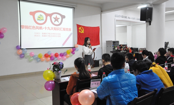12月1日,基础医学院分团委“擎扬红色风帆”十九大精神学习汇报活动在基础会议室举行。基础医学院学生科科长刘芳、基础医学院分团委近200人参加了活动。
