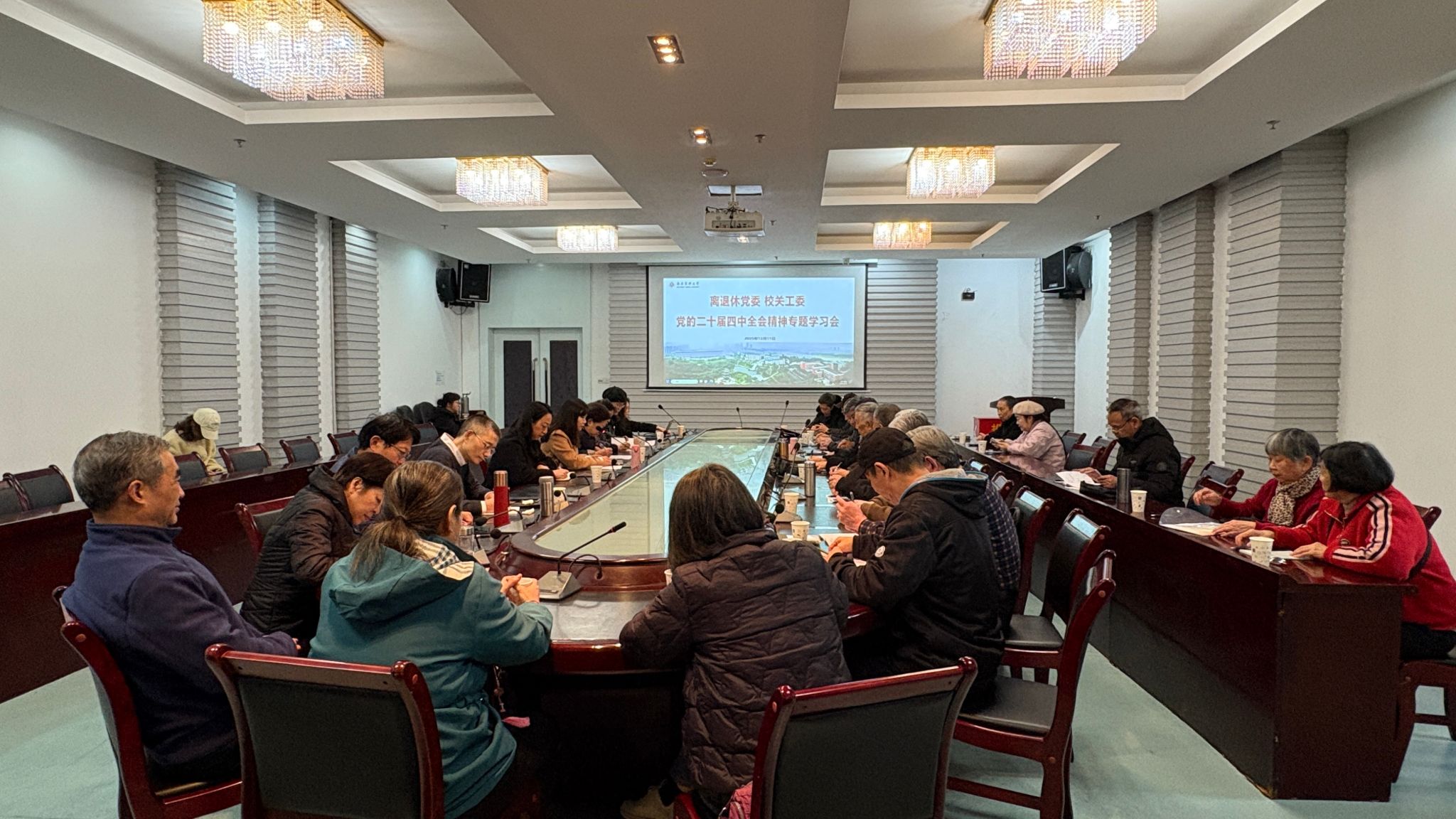 为深入学习宣传贯彻党的二十届四中全会精神,12月11日,离退休党委在城北校区三会议室召开专题学习会,离退休党支部书记、支委、“五老”宣讲团成员、校关工委退休委员、在职职工等参加学习。会议由离退休党委书记李建英主持。