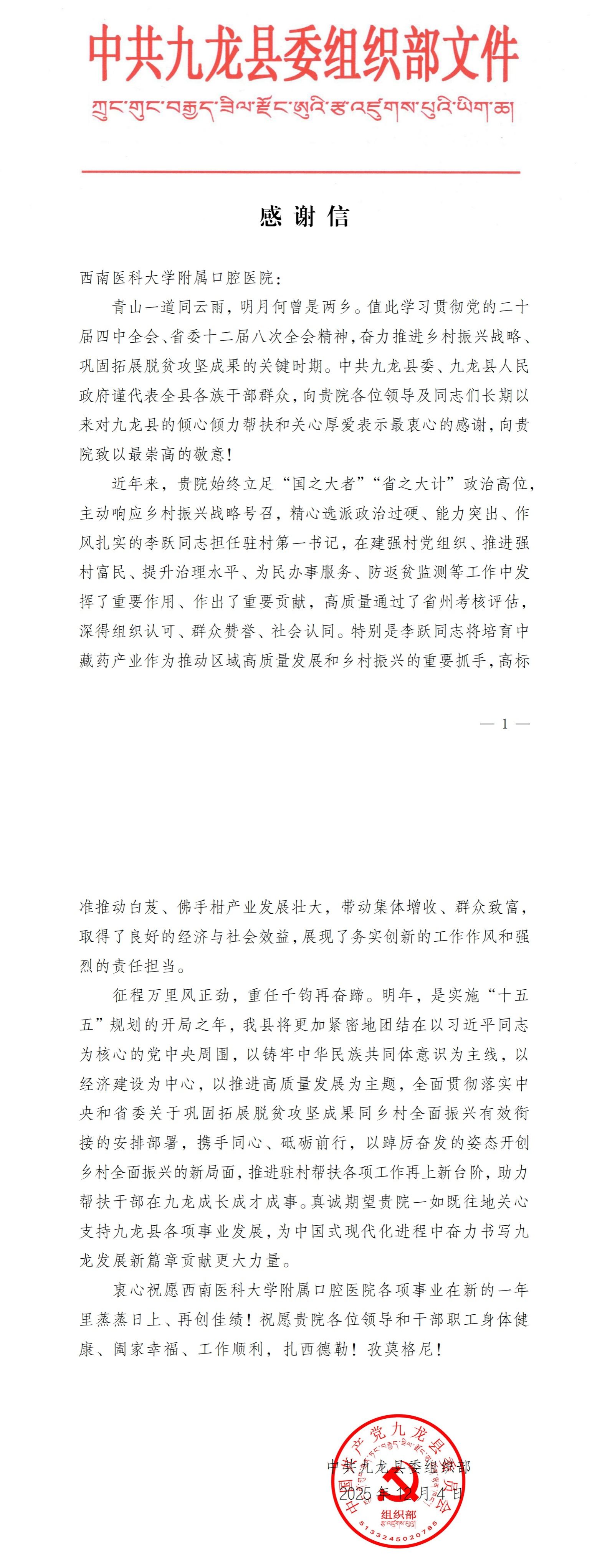 黄扎西代表九龙县委组织部郑重宣读了感谢信,对医院长期以来对九龙县乡村振兴工作的倾力支持和真情帮扶表示衷心感谢。他指出,附属口腔医院不仅选派了一批优秀的驻村干部助力九龙县乡村振兴工作,更从产业、医疗、党建等多方面给予全方位支持,切实助力九龙县巩固拓展脱贫攻坚成果同乡村振兴有效衔接,展现了高校附属医院的担当与情怀。