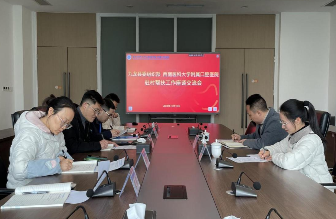 12月10日,附属口腔医院行政楼四楼一会议室暖意融融,九龙县委组织部副部长黄扎西一行专程到访,受九龙县委组织部委托向医院赠送感谢信,并围绕驻村帮扶工作开展座谈交流。会议由医院党委委员、副院长姚小东主持,医院党政办公室及乡村振兴办公室主任王光平、组织人事科副科长张晓艳、信息科副科长邓汛等参加座谈。