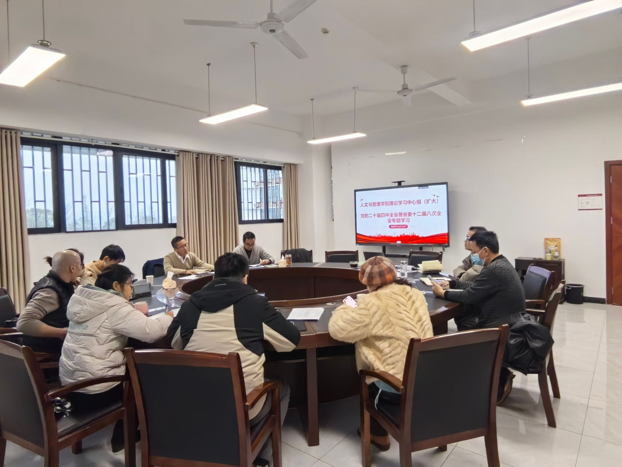 12月16日,人文与管理学院理论学习中心组召开党的二十届四中全会暨省委十二届八次全会精神专题学习(扩大)会,学院党委委员、处科级干部、支部书记及各教研室负责人参加了此次会议。会议由学院党委书记谷满意主持。