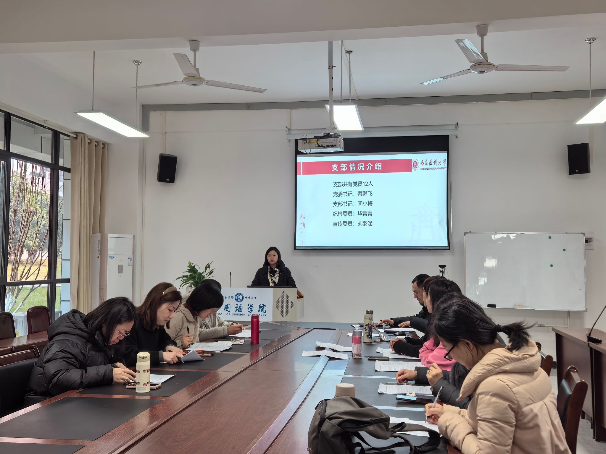 为深入学习贯彻党的二十届四中全会精神,严格党员教育管理,提升支部凝聚力和战斗力,按照学校党委组织部及学院党委的工作部署,1月14日,外国语学院职工第一党支部在文渊楼134会议室召开2025年度组织生活会暨民主评议党员大会。支部全体党员参会,学院党委书记蔡鹏飞同志受邀到会指导,会议由支部书记闵小梅主持。
