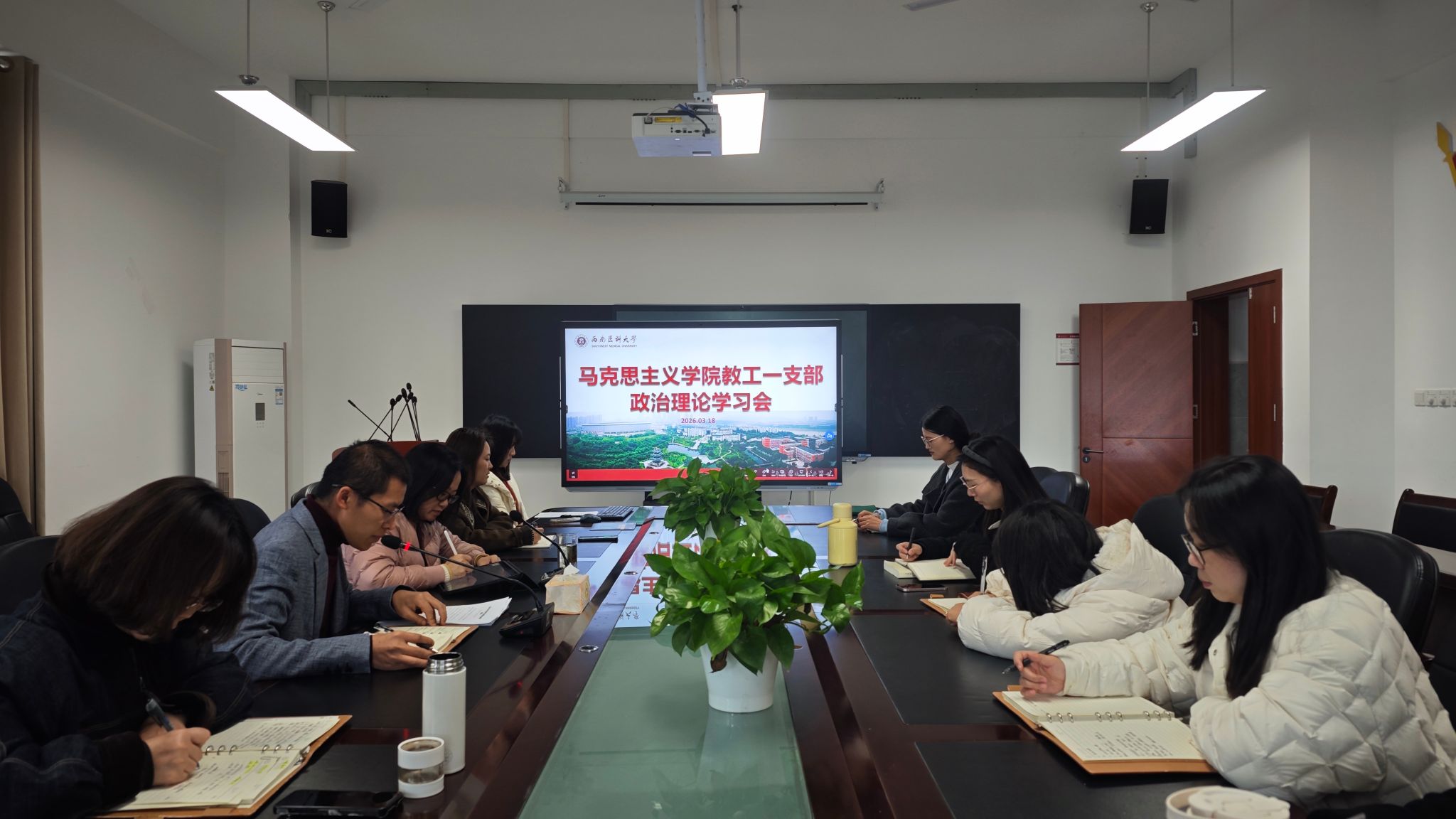3月18日下午,马克思主义学院教工一支部在文渊楼432会议室组织开展政治理论学习,会议由支部委员杨华强主持,支部党员参加。