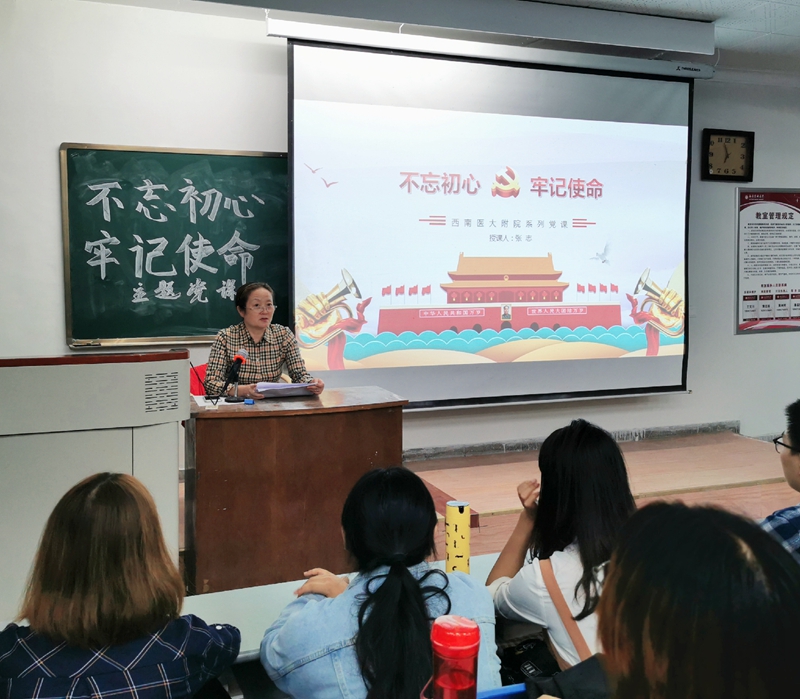 张志围绕“守初心、担使命、找差距、抓落实”总要求,结合自身学习贯彻习近平新时代中国特色社会主义思想的心得体会、个人工作经历和学校、医院和系院工作实际,讲解了自己对初心和使命的理解和认识。她谈到,作为西南医大人的初心和使命,就是时刻铭记医学生誓言“健康所寄,性命相托”,以人为本,利民、便民、为民,用奋斗践行起新时代使命担当。