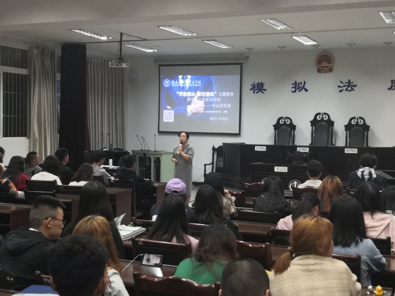 10月10日晚,法学院在模拟法庭开展了“不忘初心、牢记使命”主题教育暨学生干部素质培训讲座。法学院全体学生党员和干部参加了讲座,讲座由法学院党总支副书记黄莉主讲。