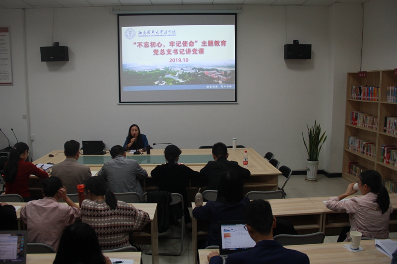 10月15日,法学院在法学院图书资料室开展“不忘初心、牢记使命”主题教育集中学习会暨党总支书记讲党课活动,法学院领导班子和全院教职工参加了活动。法学院党总支书记廖女男以《多维度把握中国共产党人的初心与使命》为题,为全院教职工上了一堂生动的党课。