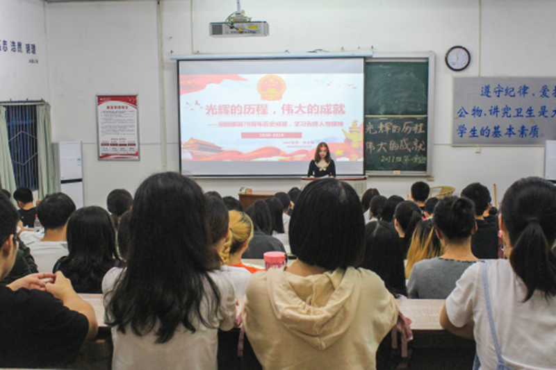 活动伊始,全体起立,唱国歌,行注目礼。杨华强对中华人民共和国成立至今的重大历史事件进行了详细的阐述;预备党员分别围绕“抗美援朝”,“两弹一星”,“杂交水稻”,“香港回归”等重大历史事件向与会人员讲述了杨根思、黄继光,于敏,袁隆平与邓小平的故事;参会同学随后进行了心得交流与分享。