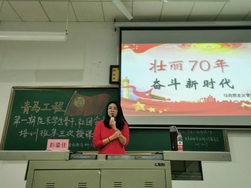 为进一步加强对学生干部的思想引领,培养其爱国热情。10月17日晚,举行了“青马工程”第一期院系学生骨干、社团会长培训班第三次理论专题学习,此次专题学习由马克思主义学院形势与政策教研室主任彭鎏佳进行授课。