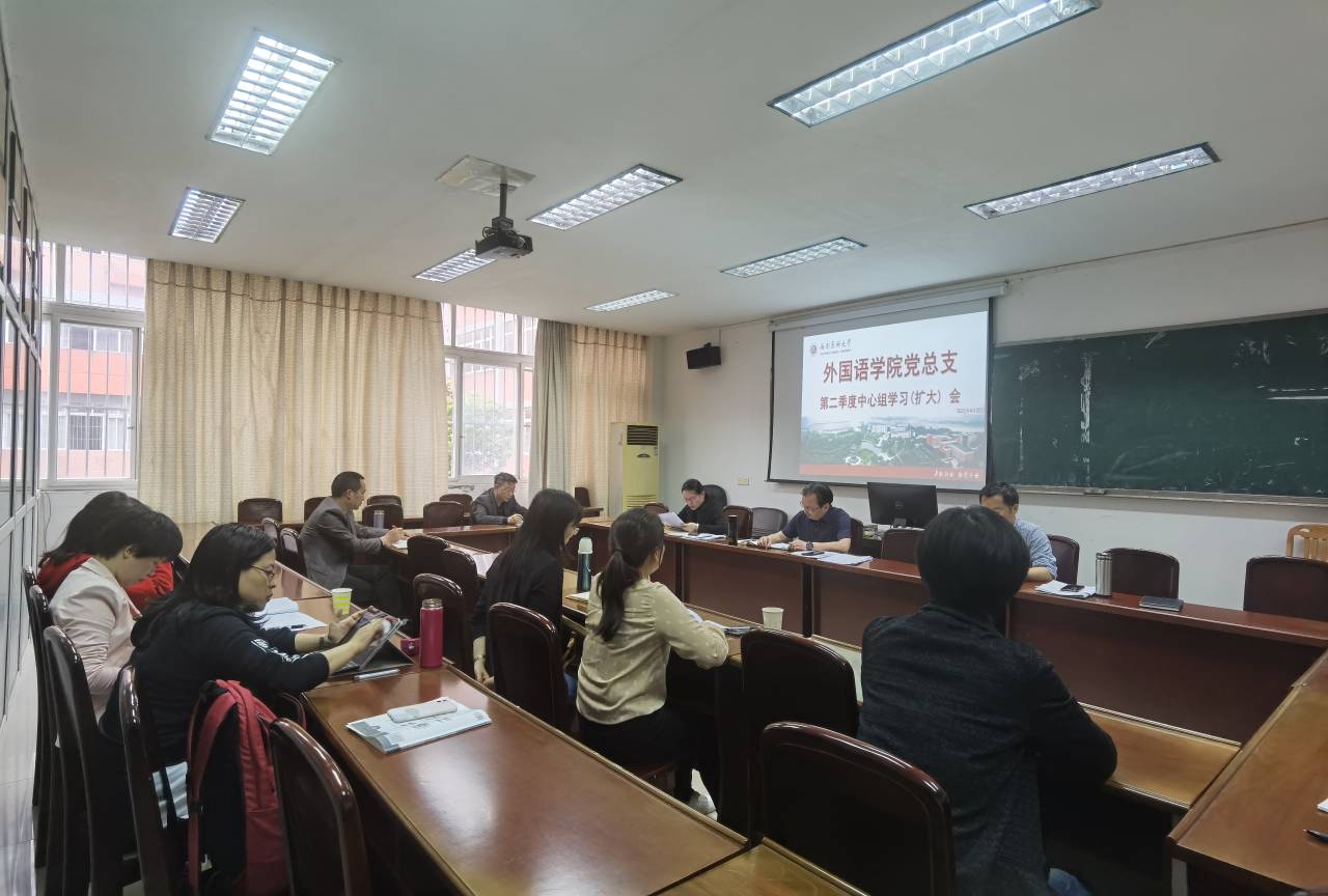 4月22日下午,外国语学院党总支在荟文楼二楼外国语学院会议室召开2021年第二季度理论学习中心组(扩大)专题学习会,学院党总支委员、党支部书记、行政科室负责人、教研室、实验室、中心负责人参会,会议由党总支书记周晓昀主持。