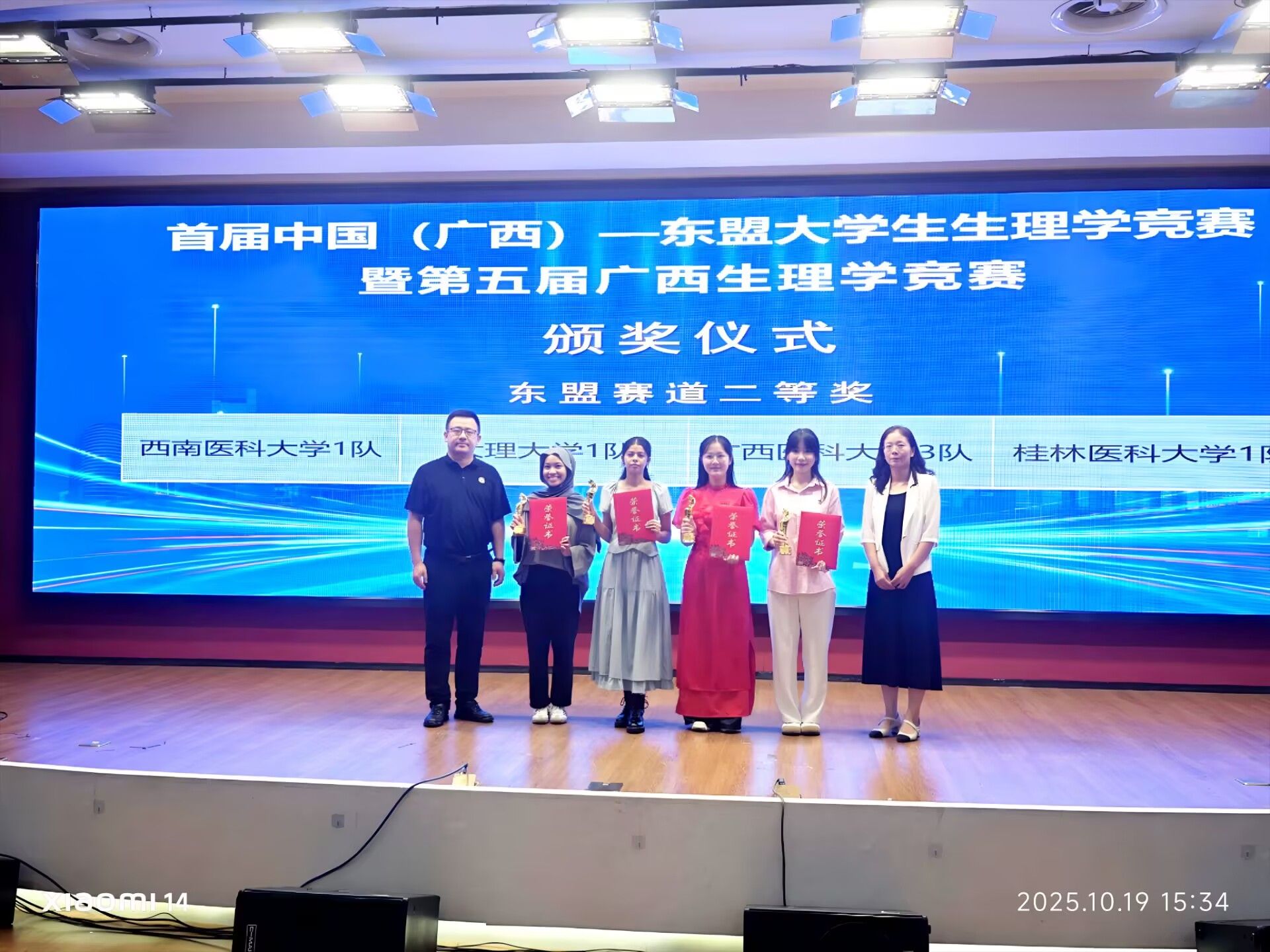 竞赛设有东盟学生赛道、本科赛道、高职赛道及中职赛道四大类别,涵盖个人必答题、团队必答题和团体抢答题三大环节,全面考察选手的生理学理论基础、知识应用能力、团队协作意识及临场反应能力。经过激烈角逐与专业评审,依据各队伍综合表现,最终评选出团体一等奖、二等奖、三等奖等多个奖项。其中,由我校基础医学院赵春玲、竹梅老师指导,中外学生协同组队——国际交流学院留学生米卡(NOOR ANQA)、莫赫西(YADAV MAHESH)与基础医学院学生高艺丹联袂出战,凭借扎实功底荣获二等奖。
