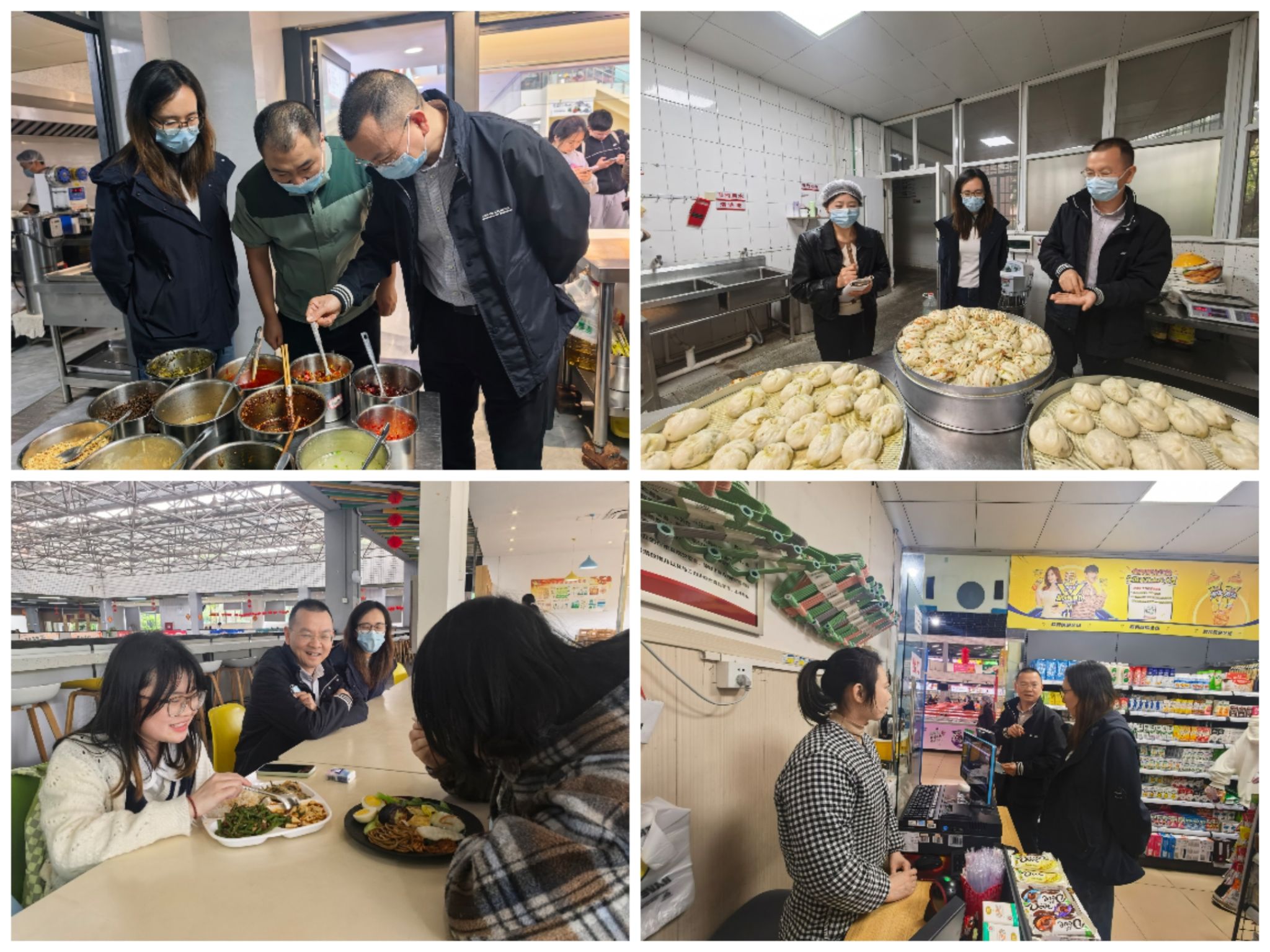 周翔宇一行先后巡查食堂后厨、就餐大厅、食品储存区、留样专区及超市等重点区域,详细了解食堂运营管理、原材料采购流程、餐具清洗消毒等环节。他强调,要严把食材源头关,确保储存条件达标、操作流程规范,切实保障师生“舌尖上的安全”。在桂香苑二楼,周翔宇与正在就餐的学生交流,认真听取大家对食堂餐饮的意见和建议,并鼓励同学们养成健康饮食习惯。