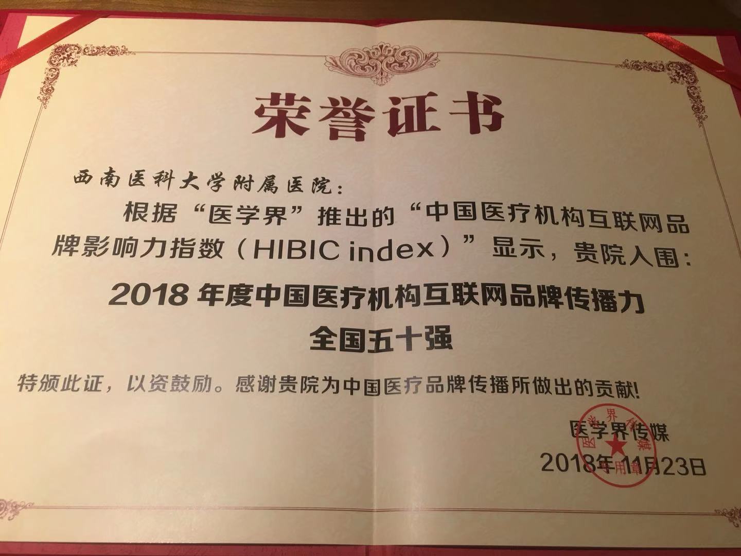 会上,发布了2018年度中国医疗机构互联网品牌影响力(HIBIC index)白皮书,西南医科大学附属医院榜上有名,分别荣获“2018年度中国医疗机构品牌传播力全国五十强(第43名),2018年度中国医疗机构互联网品牌影响力市级医疗机构全国二十强(西部地级城市仅一家),2018年度中国医疗机构互联网品牌影响力四川省医疗机构十强”。