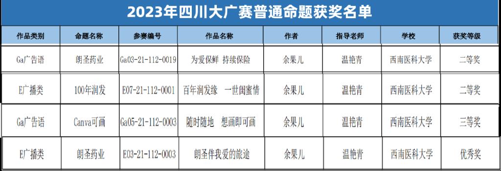 全国大学生广告艺术大赛(以下简称“大广赛”)由教育部高等教育司指导,教育部高等学校新闻传播学类专业教学指导委员会、中国高等教育学会广告教育专业委员会共同主办,是全国规模大、覆盖高等院校广、参与师生人数多、作品水准高的国家级学科A类竞赛,自2005年开始,大广赛已经连续举办18年。据悉,本届全国大广赛四川(西藏)赛区共有100余所院校参加,共收到全省各院校作品近9000件。余果儿同学的作品《百年润发缘 一世闺蜜情》(作品类别:E广播类)、《为爱保鲜 持续保险》(作品类别:Ga广告语)分别获二等奖;《随时随地 想画即可画》(作品类别:Ga广告语)获三等奖;《朗圣伴我爱的旅途》(作品类别:E广播类)获优秀奖。