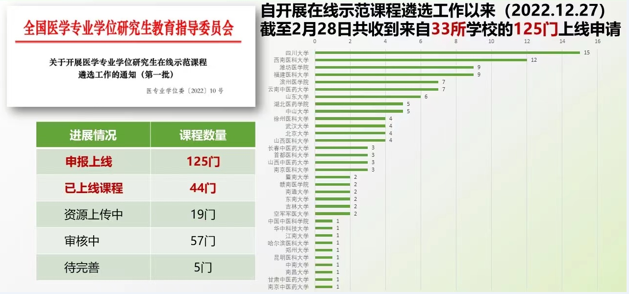 为推进教育数字化,完善医学专业学位研究生在线课程体系建设,促进医学研究生教育高质量发展,根据国务院学位委员会办公室《关于开展专业学位研究生在线示范课程建设工作的通知》,全国医学专业学位研究生教育指导委员会于2022年12月底开展医学专业学位研究生在线示范课程遴选工作。为打造精品研究生在线课程,促进线上线下教学融合发展,研究生院组织相关院所积极参与申报。截止2023年2月28日,我校共12门课程递交了在线示范课程申请。