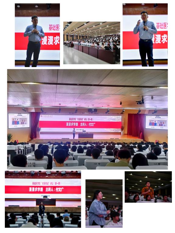 付文广结合自己的学习工作经历以及成长体会,从三个方面为同学们指明了“求学路”:1.目标是照亮成功的指航灯,通过举例说明了我们最终取得的高度或成就往往源于我们所定下的目标;2.行动是成功的必需品,只有持之以恒的自律才能推动我们向成功前进;3.信心是走向成功的动力源泉,我们的心态决定了我们会得到什么。接着,付教授强调了作为一名医生,需要有道德、有情怀、有技术、不辜负患者的信任。在互动环节中,付文广就如何平衡科研与学业的关系等问题对同学们提出了一些切实可行的建议。