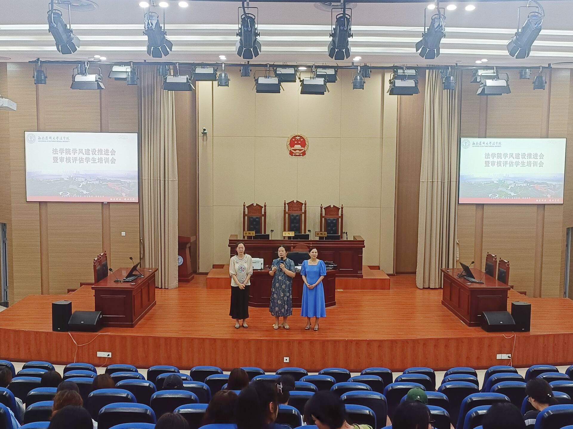 法学院于9月11日晚在模拟法庭组织开展学风建设推进会暨审核评估学生培训会。法学院党委副书记黄莉、法学院副院长羊海燕、教务科科长屈坤燕,法学院全体学生参加,会议由黄莉主持。