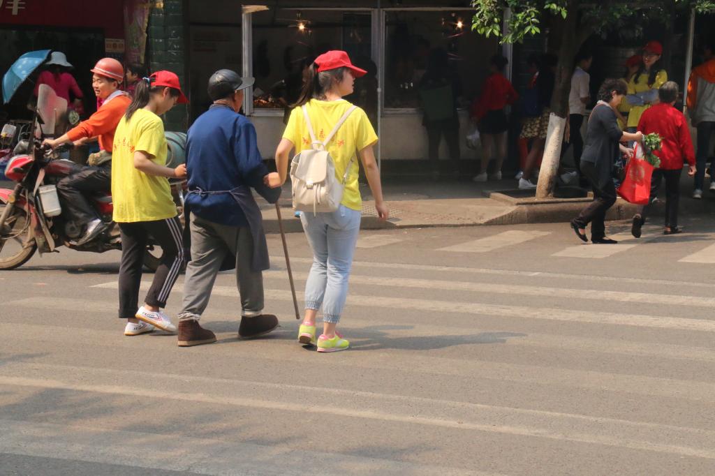 活动中,志愿者们身体力行,对“中国式过马路”、随地吐痰、乱扔垃圾等不文明行为予以温情劝导,同时对老弱病残给予积极帮扶,主动献出自己的爱心与温暖,其间不乏感动与感激。