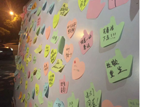 默哀结束后,留言板前,人潮挤满,只为在留言板上献上自己的祝福,表达对未来的希冀。“人间大爱”、 “逝者安息”、“加油”、“致敬生命”、“Everything will be ok”,一句句简单却又充满力量的话语正是我们对生命的致敬,对历史、对未来的寄托。系办旗帜上或红色或黑色的签名,是每一位同学对此次“汶川大地震九周年祭”的见证,每一笔每一划都深深刻在同学们心上。