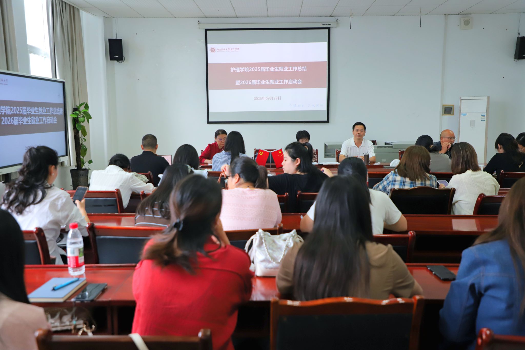 为全面总结2025届毕业生就业工作成效,安排部署2026届毕业生就业工作,9月29日,护理学院在海川楼四楼会议室召开2025届毕业生就业工作总结暨2026届毕业生就业工作启动会。全体处科级干部、学生科辅导员、兼职班主任及就业指导教师参加。会议由护理学院党委书记刘文胜主持。