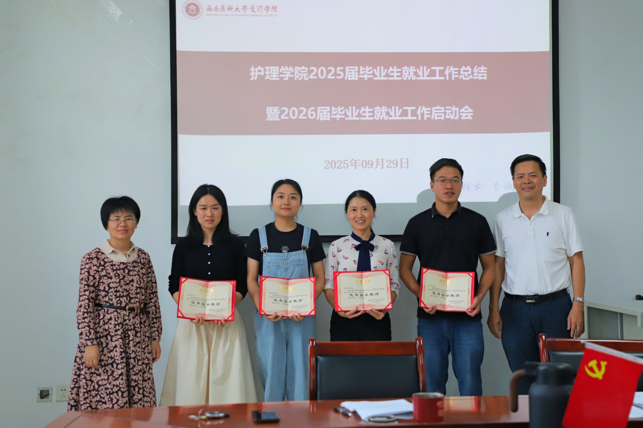 傅静教授宣读《护理学院关于表彰2025届毕业生优秀就业指导教师的决定》,经综合评定,19名教师被授予护理学院“2025年就业工作优秀指导教师”荣誉称号,学院院长陈燕华、党委书记刘文胜共同为获奖教师颁奖。就业工作优秀指导教师代表肖艳老师作交流发言,她结合自身指导案例,分享了“精准对接学生需求、分层分类开展帮扶”的实践经验。