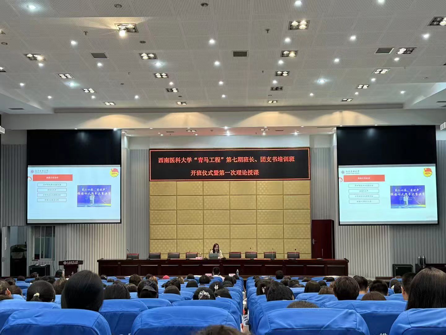 9月29日,西南医科大学“青马工程”第七期班长、团支书培训班开班仪式暨首次理论授课,在城北校区第二学术报告厅举行。校团委书记石惠、副书记高晓威出席活动,近300名来自各班级的班团骨干学员齐聚一堂,共同开启成长新征程,仪式由校团委综合科科长黄诗韵主持。