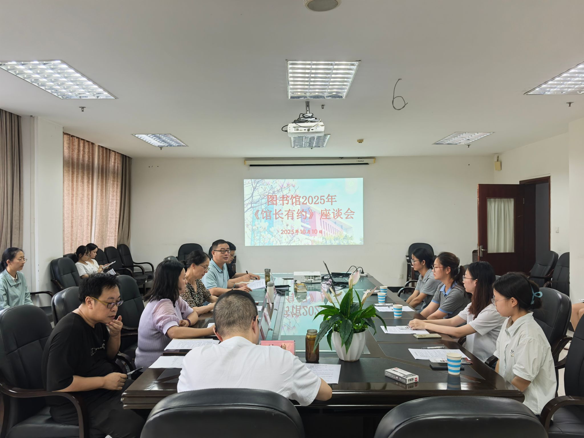 为科学制定图书馆“十五五”发展规划,提升图书馆服务质量,为读者搭建一个直接与馆长沟通交流的平台,10月10日,图书馆“馆长有约”座谈会在城北逸夫图书馆二楼会议室举行。馆长冯勤,副馆长史书龙,综合科科长刘维,技术部主任罗彬,读者服务中心吴强参加会议,读者服务中心主任胡超主持会议。