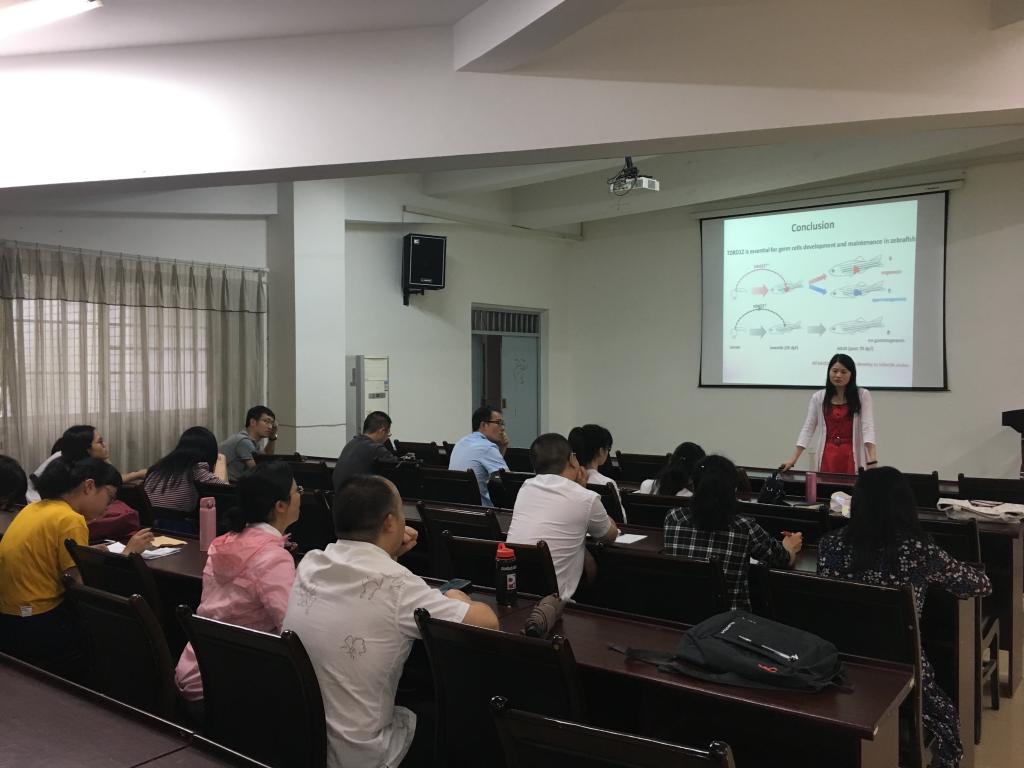在论坛中,代向燕博士作了题为“斑马鱼Tdrd12基因对斑马鱼生殖细胞发育和维持至关重要”的报告。代向燕博士首先简要介绍了斑马鱼作为模式生物在生命科学以及医学研究中的现状及其主要优势。随后,代向燕博士主要介绍了其对Tdrd12基因的研究工作。通过对斑马鱼tdrd12基因鉴定、其母源性和生殖细胞特异性表达的模式,并利用TALEN敲除技术对其功能的研究,代向燕博士发现Tdrd12在斑马鱼生殖细胞发育过程中发挥了必不可缺的作用。相关研究的前期结果发表于IJMS(International Journal of Molecular Sciences)杂志上。最后,代向燕博士就后续进一步的研究与参会人员进行了热烈的讨论。此次论坛达到了促进研究人员相互交流和活跃科研氛围的效果。