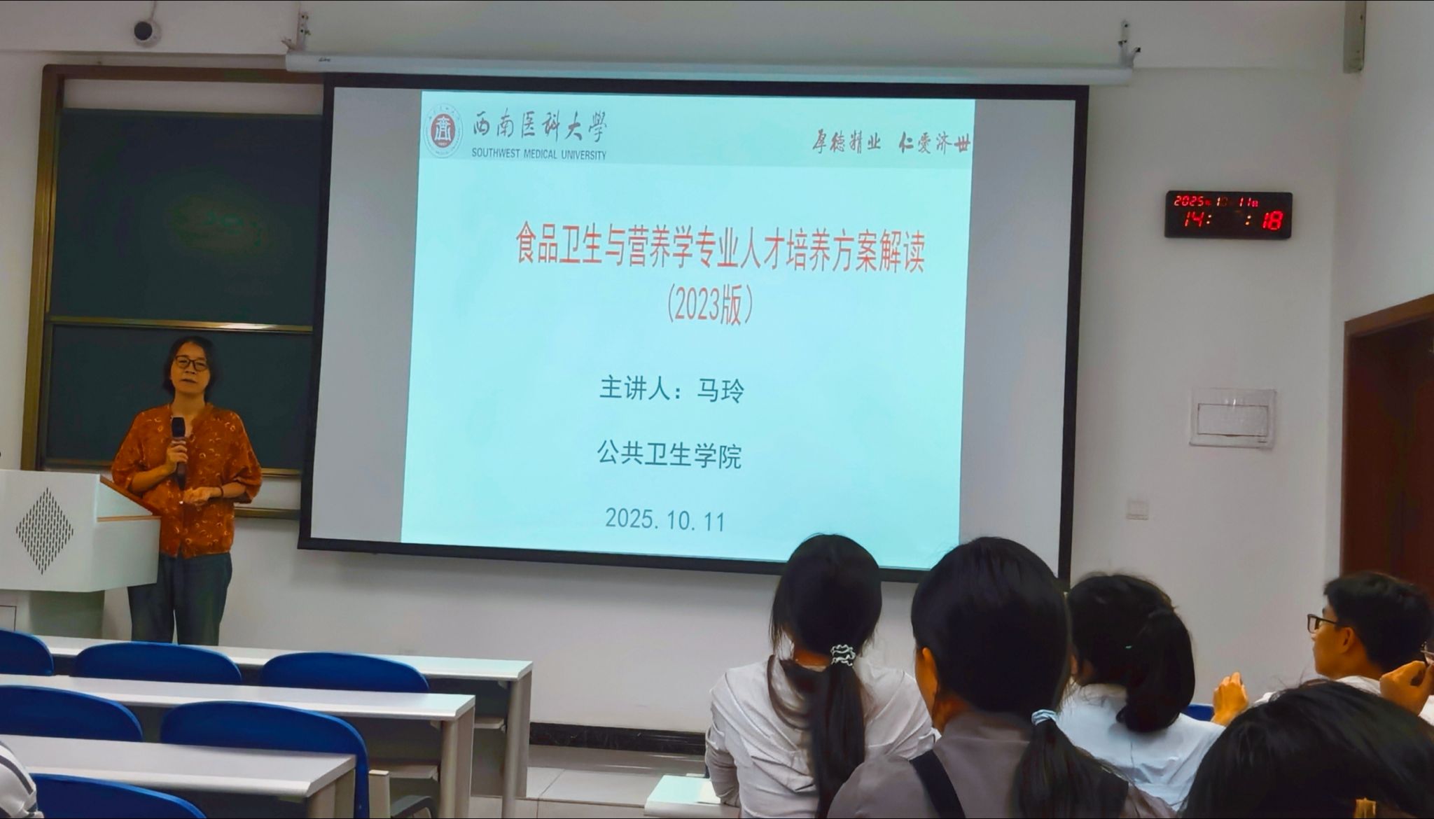 10月11日,公共卫生学院院长马玲教授在文渊楼302教室为2025级食品卫生与营养学专业新生讲授专业认知第一课,围绕人才培养方案、学业规划及大学学习特点展开深度解读,助力新生快速适应大学生活,科学规划未来。