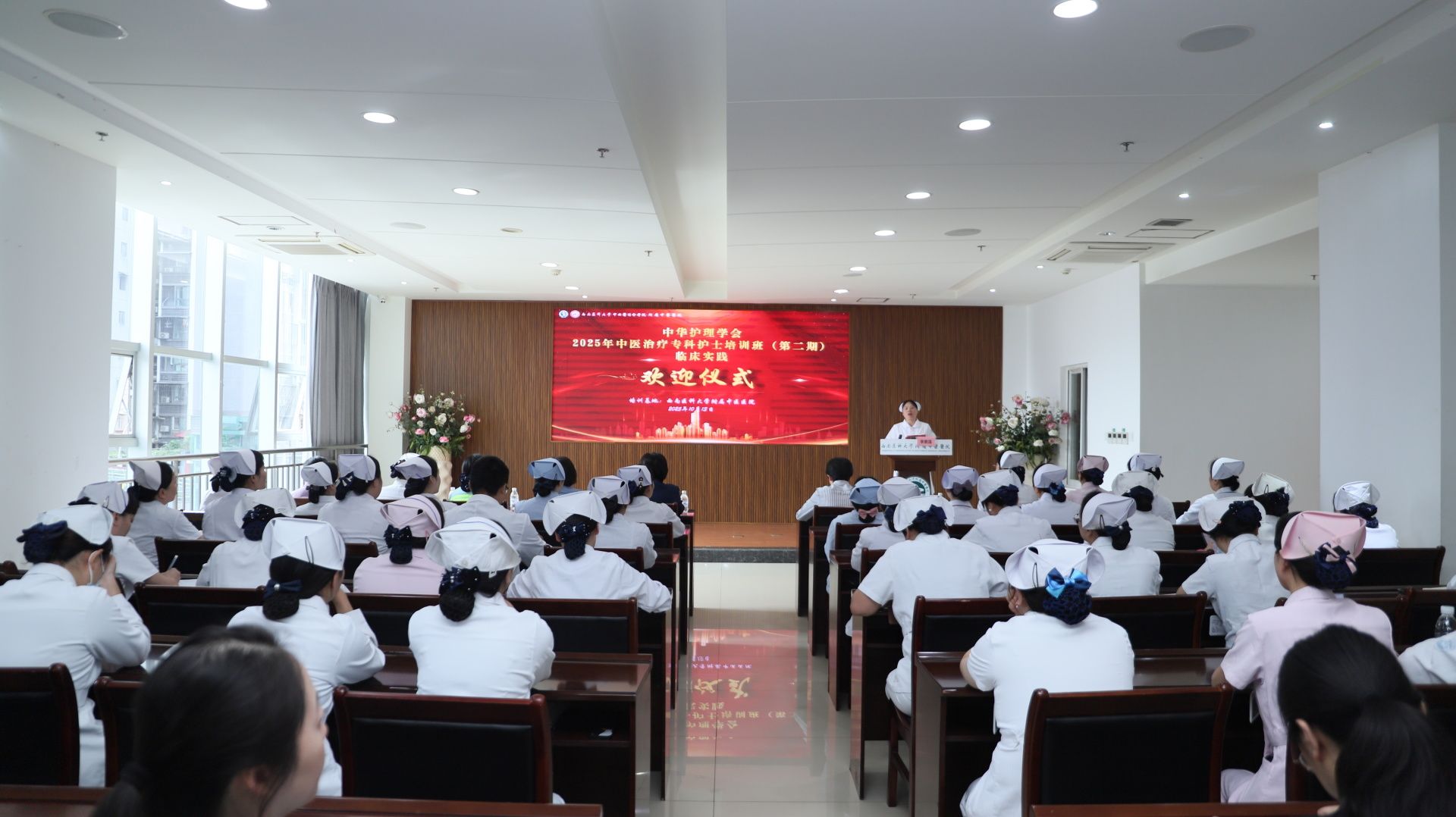 10月13日,附属中医医院举行中华护理学会2025年中医治疗专科护士培训班(第二期)临床实践欢迎仪式,医院副院长董丽,相关职能部门负责人、基地科室护士长、带教老师及来自省内外15家医院的16名培训学员参加了欢迎仪式。仪式由护理部部长李素莲主持。