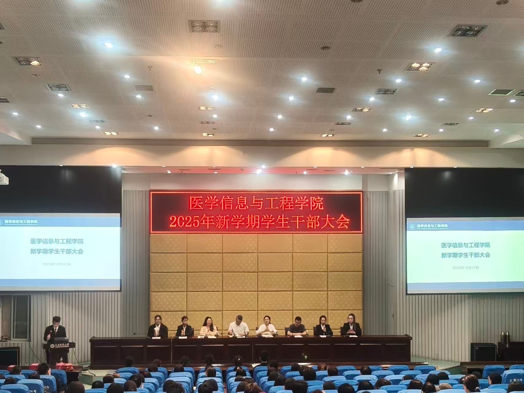 10月17日,医学信息与工程学院在第二学术报告厅组织召开2025年新学期学生干部大会。会议由学生会副主席杨科宇主持,学院党委副书记刘玉清、学生科副科长刘梦萝、专职辅导员彭雪梅、兼职辅导员冯德龙、学生会全体成员、各班班委、室长参加会议。此次会议旨在让各个干部明确工作内容及工作要求,优化部门内部建设,为新学期学生工作的顺利开展奠定坚实基础。