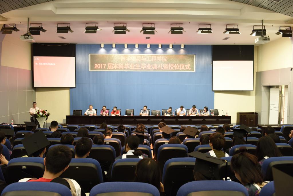 6月28日上午,医学信息与工程学院2017届本科生毕业典礼暨授位仪式在忠山校区学术报告厅举行。医学信息与工程学院院长尹德辉、副院长罗亚梅、党总支副书记杨勰,各科室负责人、教研室主任及2017届全体本科毕业生参加了典礼。典礼由学生科副科长万江中主持。