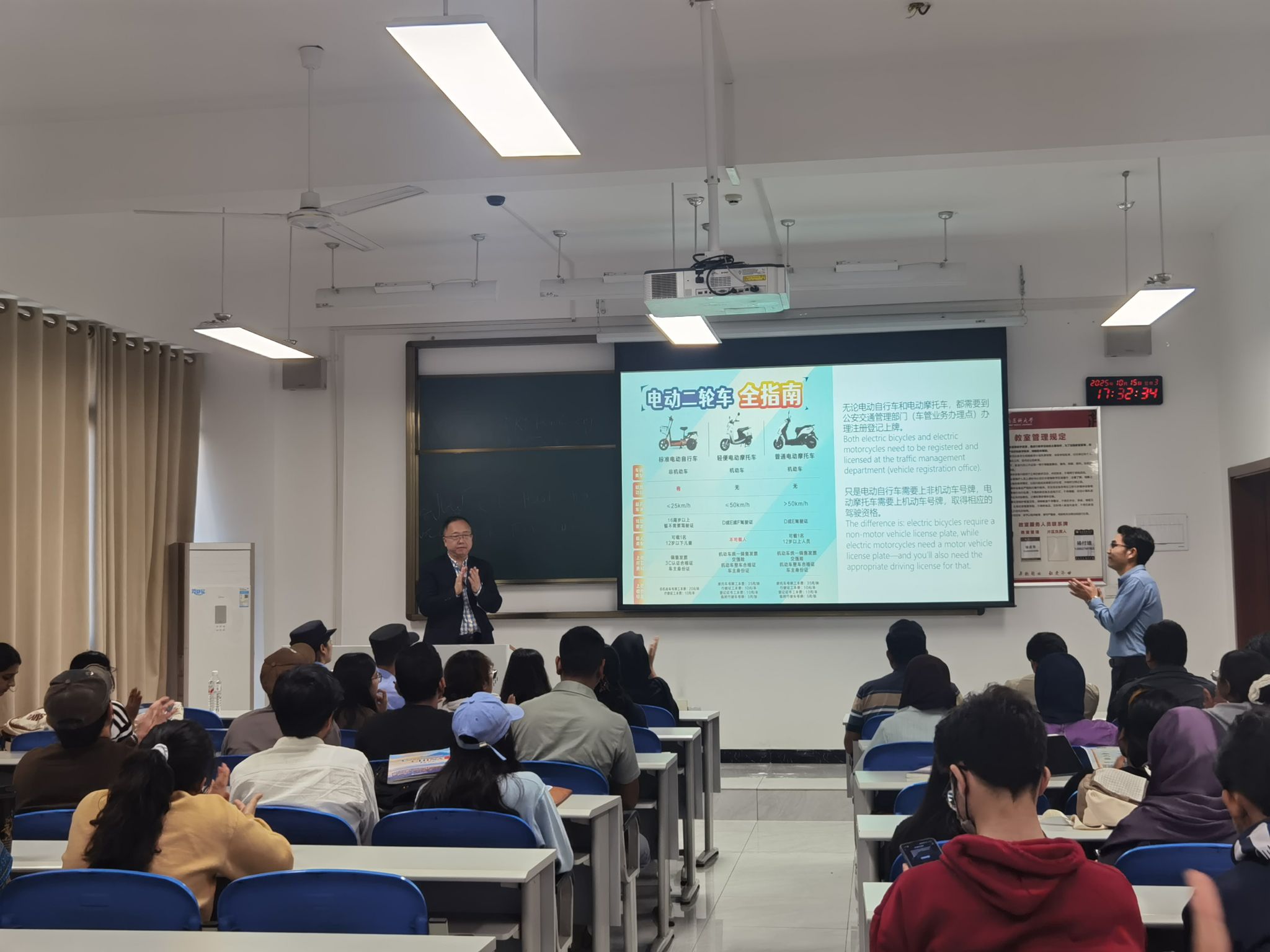 此次宣讲会不仅让国际学生清晰掌握了中国电动两轮车相关法律法规与学校管理要求,更有效提升了其交通安全意识与自我保护能力。国际教育学院后续还将持续关注国际学生交通出行情况,组织定期排查,进一步巩固治理成效,营造安全、有序的校园环境,为国际学生的学业成长护航。