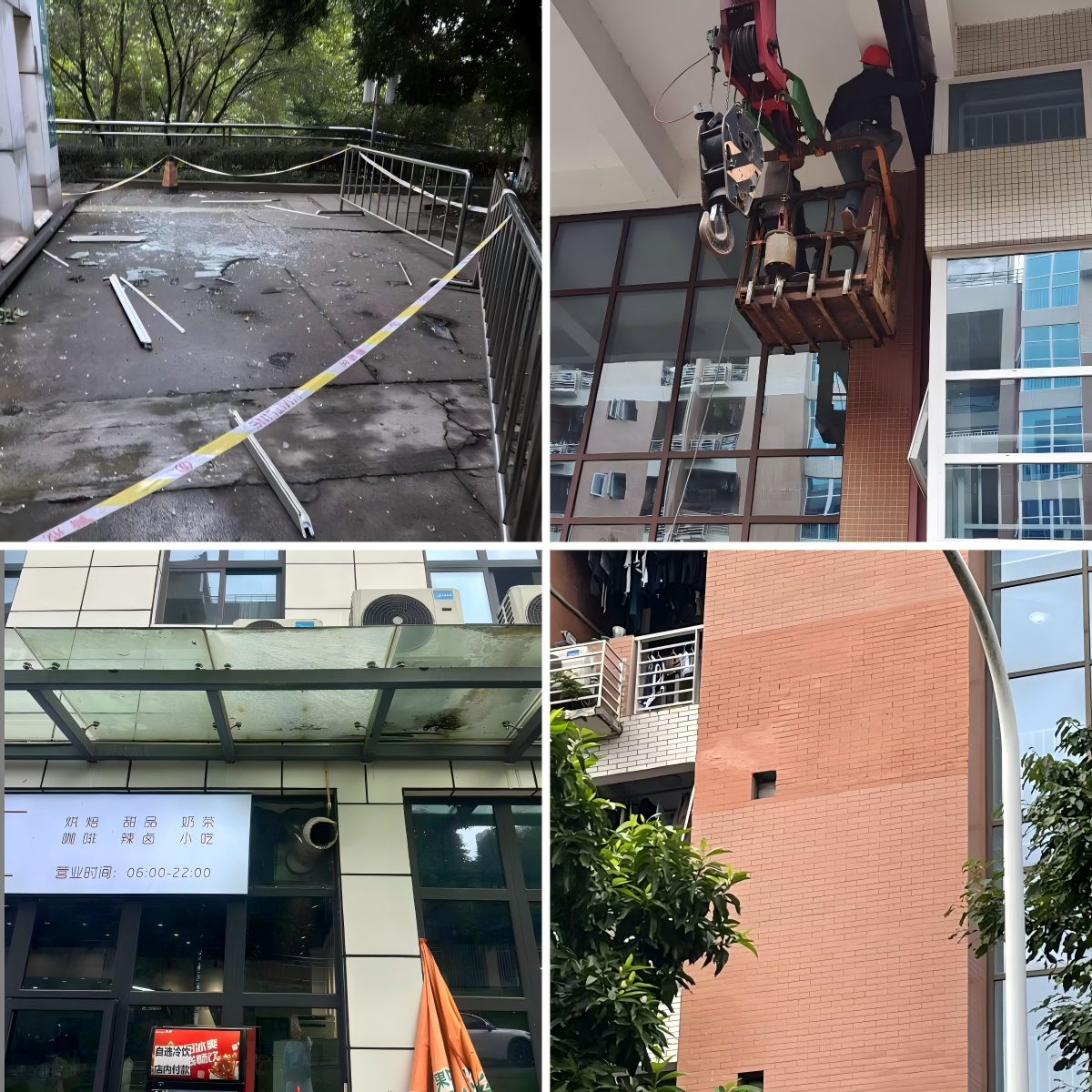 险情发生后,基建后勤处维修人员迅速赶赴现场,对涉险楼栋开展“拉网式”全面踏勘,重点核查外墙砖空鼓范围、外窗变形程度及玻璃破损具体位置。处置期间,工作人员全程驻守现场,严格遵循建筑安全操作规范,逐一落实隐患整改措施:对松动空鼓的外墙砖实施拆除重铺,对变形外窗框架进行校正加固,对破损玻璃及时更换处置。经过连续高效作业,所有隐患点整改工作全部完成,经现场验收合格后,学校正式拆除涉险区域警戒线,全面恢复楼栋周边正常通行秩序。
