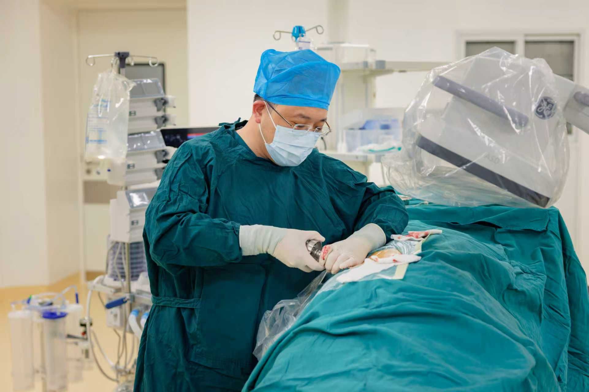 以往,传统手术创伤大、恢复周期长,使不少患者心存顾虑。如今,随着椎间孔镜微创技术的引入,患者迎来了康复新希望。术中,疼痛科王江林主任带领手术团队,通过C型臂引导精准定位,将工作套管准确置入腰椎间盘突出相应节段的靶点位置,实现精准治疗。