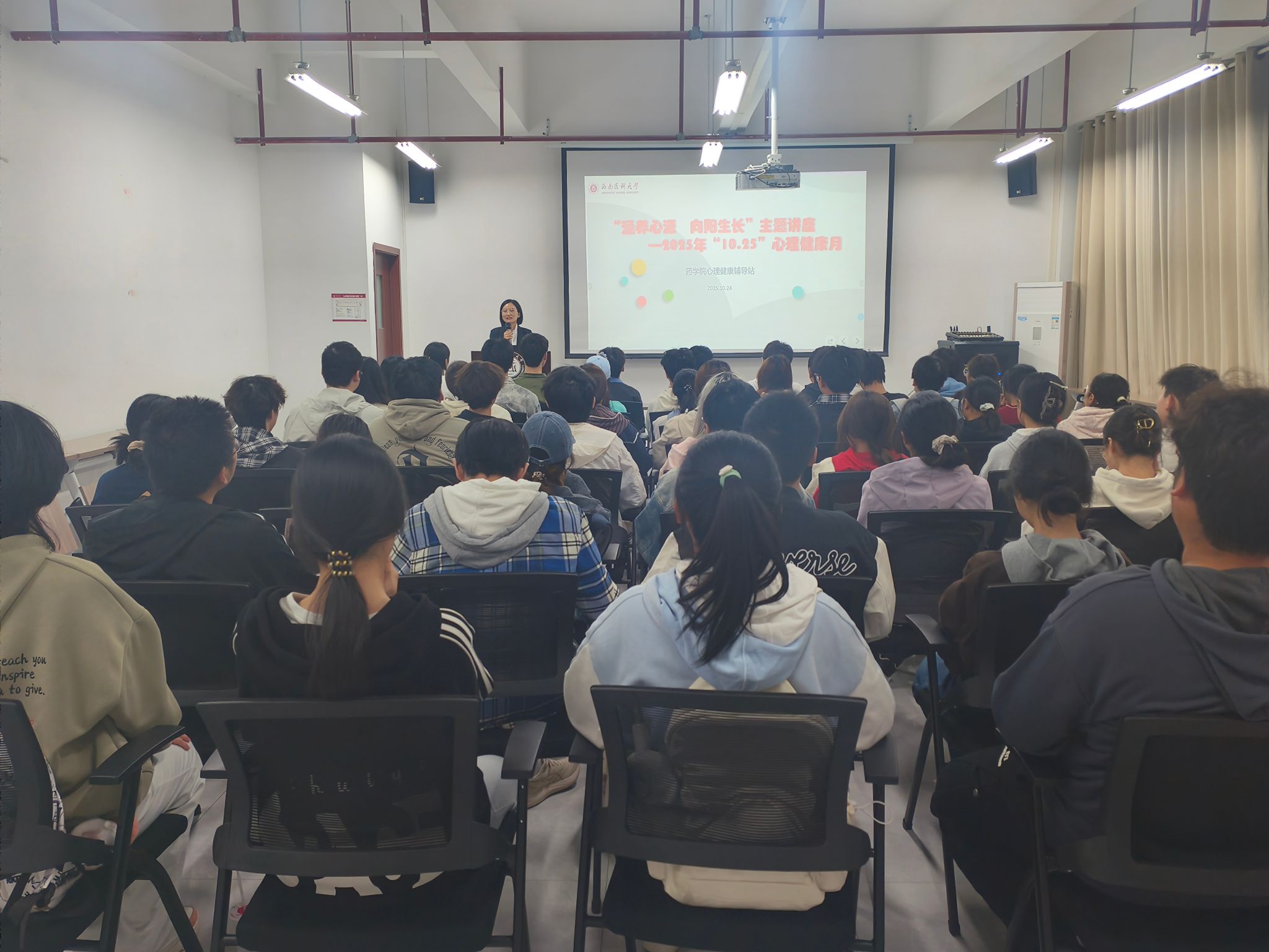 10月24日,药学院在弘润楼532室开展“10·25心理健康月”系列活动之“涵养心愿,向阳生长”主题讲座。学生心理健康教育与咨询中心主任蒋玉梅担任主讲,药学院60余名学生心理骨干通过理论学习、案例研讨、互动实践等形式,系统接受心理健康知识培训,为筑牢学院心理健康防护网注入新生力量。