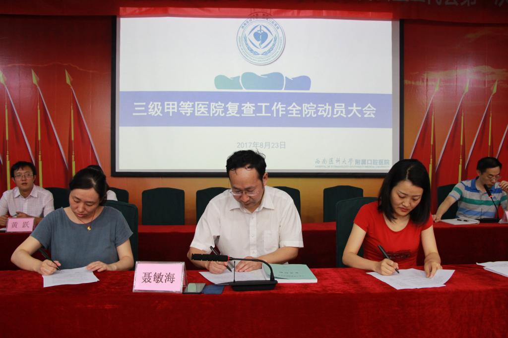 会上,全院科室和部门负责人签定《三甲复查目标责任书》,促进医院管理、医疗、教学、科研等各方面工作全面发展和持续改进,确保医院三甲复查取得优异成绩并顺利通过。